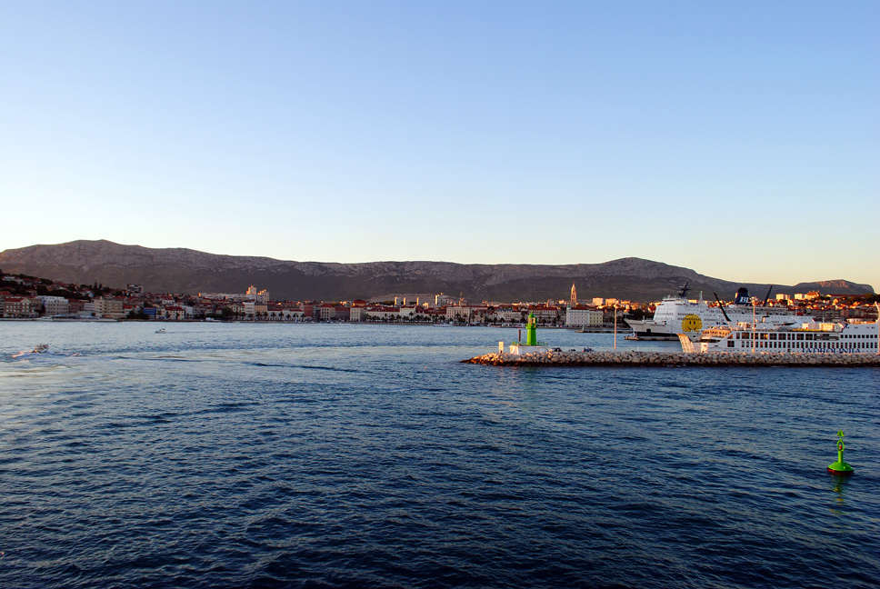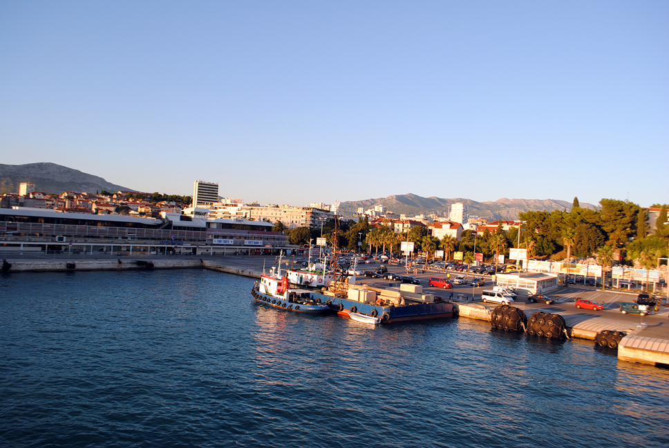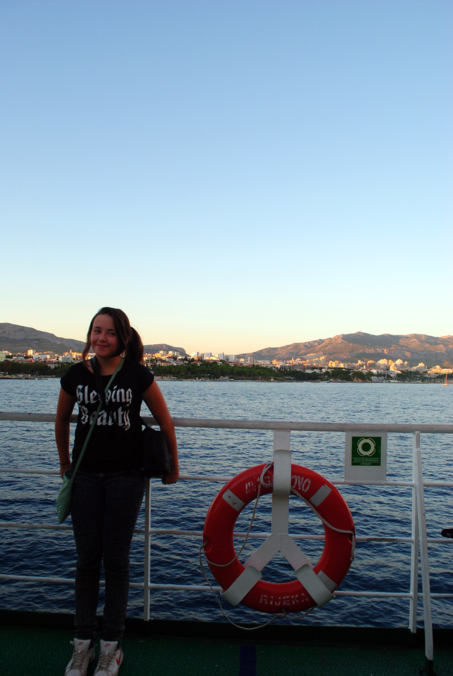 W drodze do Splitu kontaktujemy się ze znajomymi, okazuje się że zaspali w Słowacji i pojechali płatną autostradą A1 w Chorwacji. (najlepszy tekst po obudzeniu się kumpla (Leszka) w Słowacji – (Budzę się podbiegam do okna i krzyczę „Marysia , dzieciaki wstawać szybko, Karoliny i Bastka już bardzo dawno nie ma, he he he…….bardzo dawno”. Okazało się że przyjechali do Splitu szybciej niż my. (ciekawe z jaką prędkością jechali ?) W porcie spóźniamy się na prom i musimy czekać 1,5h. W tym czasie kupujemy bilety (Auto+4 osoby, koszt 266 HRK czyli ok. 150zł) ustawiamy auto i spokojnie czekamy na naszą kolej. Jest godz. 18:10, prom mamy o 19:30. W końcu odpływamy i patrzymy na powoli oddalający się ląd.