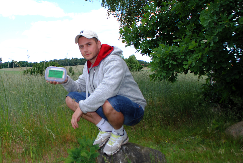 W końcu dojechałem do mało mi znanej miejscowości – Młynek. Stamtąd już niedaleko do miejsca ukrycia. Będąc 200m od celu, nawigacja wyprowadziła mnie w krzaki. No to ładnie, taszcząc rower w krótkich spodenkach, niechybnie stanę się pożywieniem dla kleszczy. Na szczęście nic się do mnie nie przykleiło. Szybko wypatrzyłem geocache’a który leżał sobie odsłonięty obok kamienia. Słabe maskowanie? a może ktoś znalazł i zostawił. Skrzynka fajna, opisująca ciekawą historię z okresu wojny.